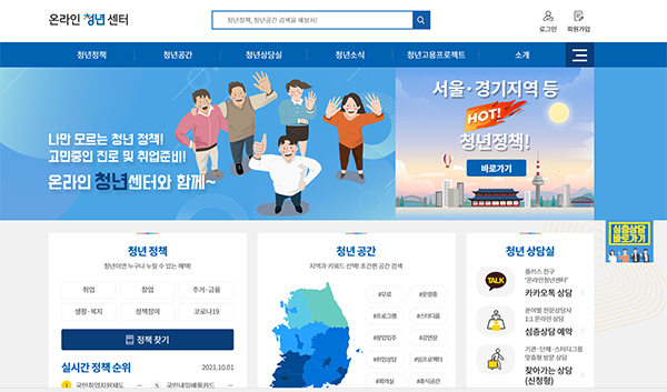 온라인 청년센터(https://www.youthcenter.go.kr) 메인화면.