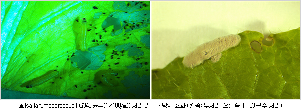 실험 결과, 온실 배추에 파밤나방 3령 애벌레를 접종한 후 ‘FG340’ 균주를 108포자수/㎖ 농도로 뿌렸을 때 60.8%의 살충 효과를 나타냈다. 특히, 온도 20℃∼30℃, 상대습도 90% 이상일 때 가장 큰 효과를 볼 수 있었다.