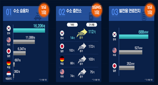 이를 바탕으로 수소차·수소충전소·연료전지 보급에 2년 연속 세계 3관왕을 기록했으며 트램, 화물·청소트럭, 지게차 등 다양한 수소 모빌리티도 실증 중이다.