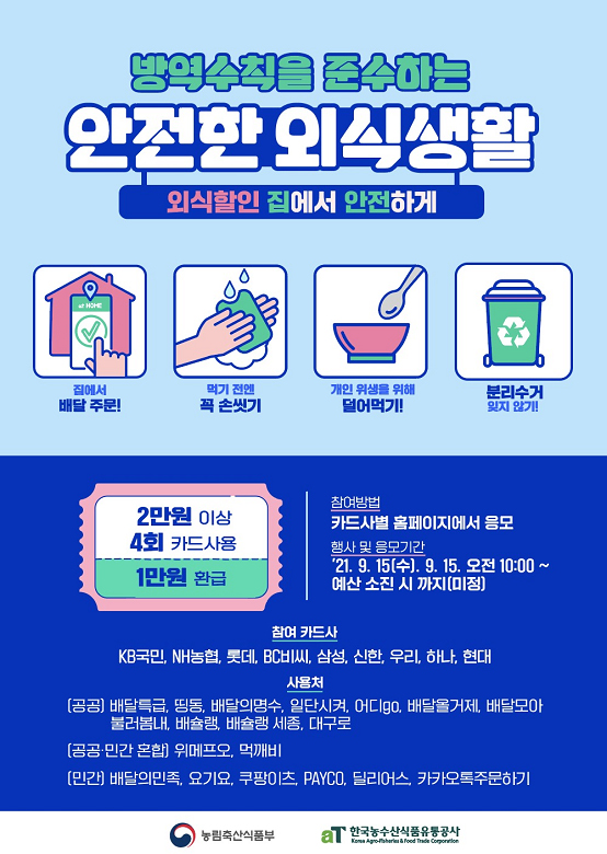 앞서 농식품부는 코로나19 상황 지속에 따른 내수 경기 위축 최소화를 위해 비대면 외식 할인 지원을 지난달 15일 재개한 바 있다.