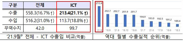 지난 9월 정보통신기술(ICT) 수출은 213억 4000만 달러를 기록했는데, 수입은 113억 7000만 달러였고 무역수지는 99억 7000만 달러 흑자로 잠정 집계됐다.