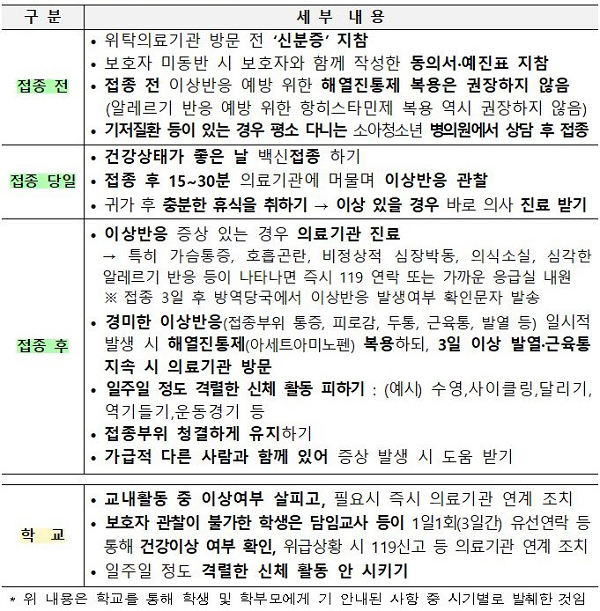 특히 접종 이후 2∼3일은 안정을 취하고 1주일 정도는 과격한 운동을 피하도록 안내하면서, 이상반응 관련 상황은 상시 공유하고 교내 활동 중 이상반응 발생 시 신속한 의료기관 연계 조치와 중증 이상반응 학생에 대한 예후 및 출결 관리 등을 집중 지원하기로 했다.