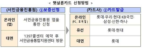 카드 발급은 서민금융진흥원에 보증신청 후 심사를 거쳐 보증약정을 체결한 경우, 7개 협약카드사 중 1곳을 선택해 신청할 수 있고, 보증신청은 서민금융진흥원 앱 또는 서민금융통합지원센터 방문을 통해 심사를 거쳐 약정을 체결한다. 7개 협약카드사에 온라인(PC, 모바일), 유선, 대면의 방식으로 카드발급을 신청할 수 있다.