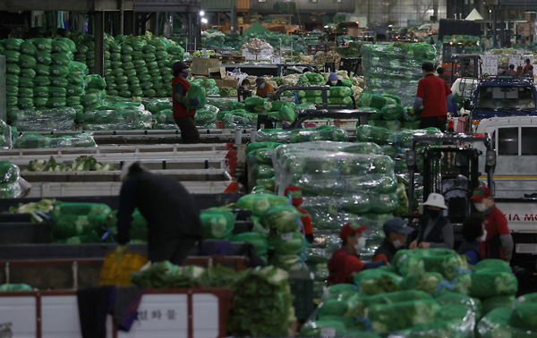 서울 송파구 가락농수산물종합도매시장의 모습. 농업인, 경매인 등이 각 지역에서 올라 온 배추들을 정리하느라 분주하다.(사진=문화체육관광부 국민소통실)