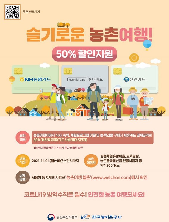 방문객 감소로 피해가 큰 농촌관광업계의 지원 효과를 높이기 위해 할인율을 50%로 높이며 3개 제휴 신용카드사(NH농협·신한·현대)가 농촌관광경영체에서 결제한 내역을 확인해 결제 금액의 일정액을 환급하는 방식으로 지원된다.