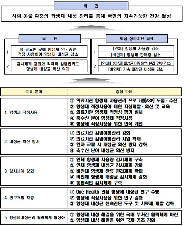 특히 국가 항생제 내성관리 대책을 지속 추진하기 위해 범부처 항생제 내성 포럼과 협업과제 운영 등 항생제 내성관리를 위한 인체-비인체 분야 협력체계를 구축하고, 이를 바탕으로 국제 항생제 내성 대책과 감시체계 참여를 통해 국제 공조한다.