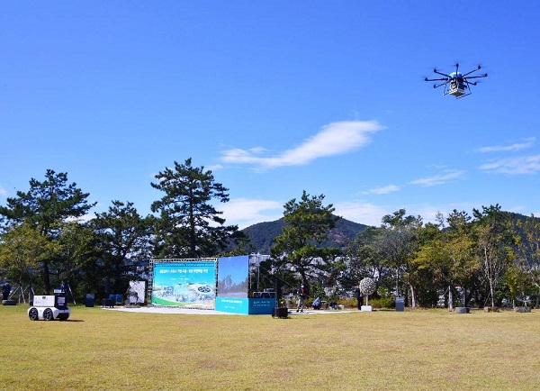 ▲ 지난해 12월 13일 전남 여수시 장도 잔디광장에서 열린 드론·로봇 언택트 배송서비스 시연회 모습.그동안 ‘생활물류서비스산업발전법’(이하 생활물류서비스법) 상 운송수단이 화물자동차와 이륜자동차로 한정돼 드론·로봇을 활용한 생활물류서비스의 법적 근거가 없었다.