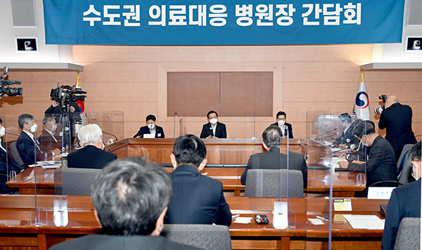 ▲ 김부겸 국무총리가 19일 정부서울청사에서 열린 수도권 의료대응 병원장 간담회를 주재하고 있다.(사진=국무조정실)김 총리는 “무엇보다도 부족해진 병상을 신속하게 확충하는 일이 우선”이라며 “각 의료기관에서 필요로 하는 인력과 장비를 발빠르게 지원하면서 현재 확보 중인 병상들이 최대한 빨리 가동될 수 있도록 노력하겠다”고 강조했다.