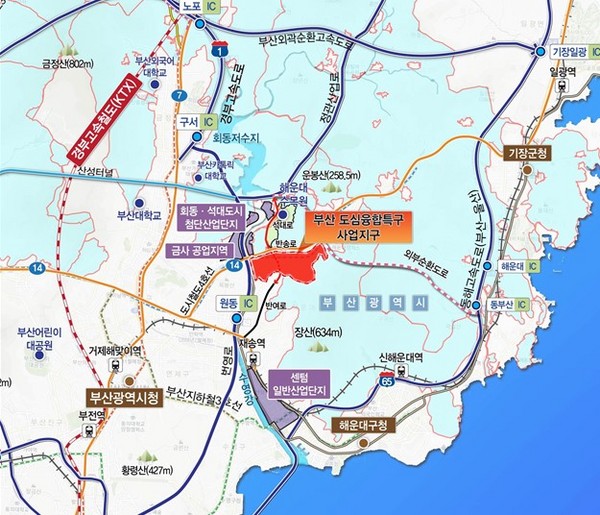 ▲ 부산 도심융합특구 사업지구 위치도.부산시는 도심융합특구 기본계획 수립에 착수해 첨단산업시설과 주거·상업·문화가 공존하는 복합혁신시설 구축 등 광역거점 조성을 위한 실행전략을 구체화하고 사업지구 내 산업시설 등의 이전 협의 등을 진행할 계획이다.