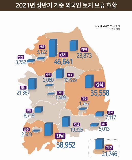 지역별로는 경기도가 4664만㎡(전체의 18.2%)로 외국인이 가장 많은 토지를 보유하고 있는 지역으로 조사됐다. 이어 전남 3895만㎡(15.2%), 경북 3556만㎡(13.8%), 강원 2387만㎡(9.3%), 제주 2175만㎡(8.5%) 순으로 나타났다.