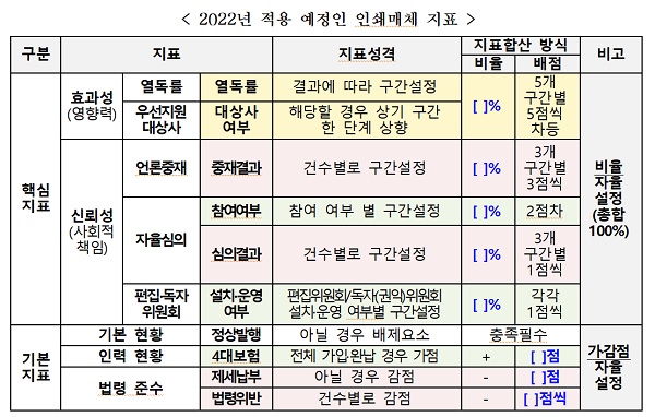 기본지표는 매체사의 정상 발행 여부, 관련 법령 위반 여부, 제세 납부 여부, 직원의 4대 보험 가입·완납 여부이다.
