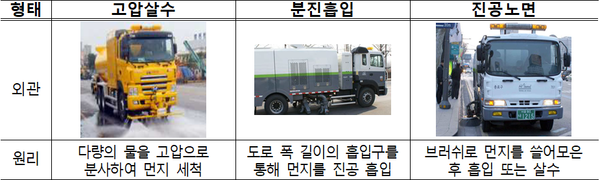 도로청소는 고압살수차, 진공노면차, 분진흡입차 등을 이용하고, 기온 5℃ 미만인 경우는 도로 결빙 우려 등으로 물청소를 하지 않는다.