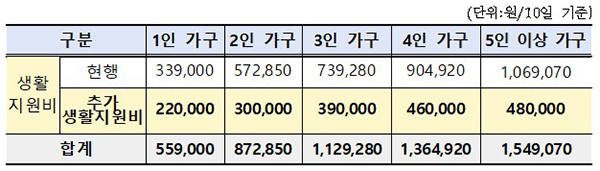 이에 따라 1인 가구는 현행 33만 9000원에서 추가 생활지원비 22만원을 더하고, 2~5인 이상 가구도 각각 30만원부터 48만원까지 더 지원받게 된다.
