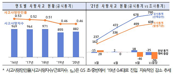 한편 정부의 산재 사망사고 감축 노력 결과, 사망사고는 2017~2018년 900명 중·후반대에서 2019년 855명으로 줄었고, 2020년 882명으로 다소 증가했으나 올해 11월말 현재 790명으로 전년 동기 대비 25명 감소한 것으로 나타났다.