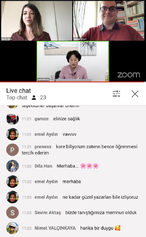 ▲ 황선미 작가와의 만남 온라인 생중계 및 실시간 댓글 화면. (사진=주터키한국문화원)이번 행사에서는 양국의 출판부문 시장 보고와 베스트셀러 도서에 대한 현황 발표를 진행, 양국 간 저작권 교류를 촉진·지원하는 한국문학번역원과 터키문학번역원, 한국출판문화산업진흥원 등 기관 관계자들의 발표가 이어졌다.