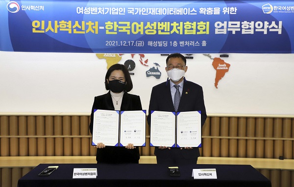 인사혁신처와 한국여성벤처협회는 17일 서울 역삼동에서 ‘여성 벤처기업인의 국가인재데이터베이스 확충 및 활용을 위한 업무협약(MOU)’을 체결했다고 밝혔다.