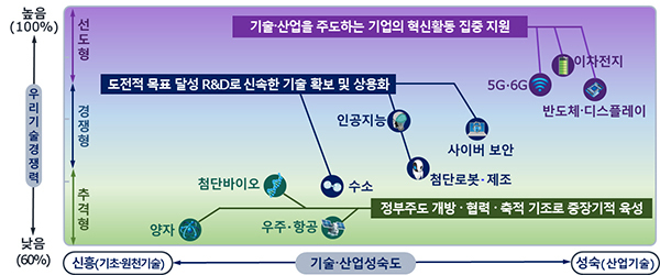 이에 따라 현재 최고 기술국 대비 60~90%에 머물고 있는 기술수준을 2030년까지 90% 이상 달성을 목표로 국가역량을 집중하는데, 필수전략기술별 특성을 고려한 맞춤형 전략방향을 토대로 기술의 확보부터 보호까지 종합적 육성·보호 전략을 추진한다.