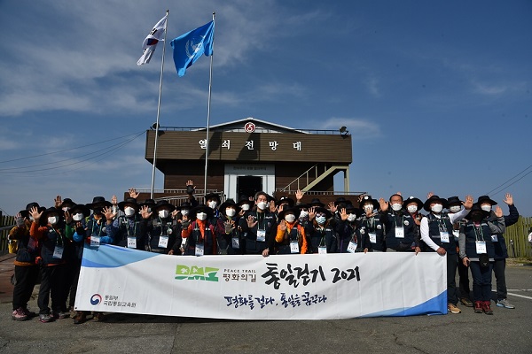 ▲ 이인영 통일부 장관이 지난 11월 6일 DMZ 평화의길 통일걷기 제3차 동서횡단행사 발대식에 참석하여 관계자들과 기념 촬영을 하고 있다. (사진=통일부)미래세대 중심의 새로운 소통 방식을 통한 통일공감대를 확산한다.