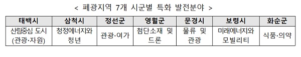 광업비중이 상대적으로 높고 산업기반이 열악한 강원도 4개 시군은 산림·관광·여가 중심의 산업기반을 조성하고 그 외 시군은 미래에너지·의약 등 신산업 중심의 산업성장을 추진하기로 했다. 태백시 산림중심관광·자원, 삼척시 청정에너지와 청년, 정선군 관광·여가, 영월군 첨단소재 및 드론, 문경시 물류 및 관광, 보령시 미래에너지와 모빌리티, 화순군 식품·의약으로 특화한다.