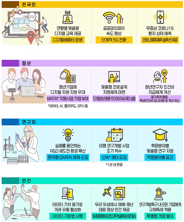 또 우주와 탄소중립, 바이오 등 경제·사회를 변화시킬 미래기술을 지원하고 현재 추진 중인 디지털 뉴딜 정책에도 속도를 붙인다.