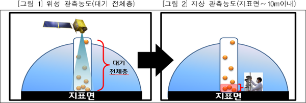 국립환경과학원 환경위성센터에서는 대기 전체층을 관측하는 환경위성 자료(그림 1)에 기상 등 다양한 자료와 인공지능 기법을 적용하여 국민 건강에 직접 영향을 주는 지상 미세먼지 농도(그림 2)로 변환하는 기법을 개발한 뒤 지상 미세먼지 추정농도를 산출하고 있다.
