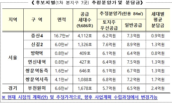 사업 추진 후 처음으로 본 지구로 지정되는 후보지는 증산4구역(4112가구)을 비롯해 신길2(1326가구)·방학역(409가구)·연신내역(427가구)·쌍문역 동측(646가구)·쌍문역 서측(1088가구)·부천원미(1678가구) 등 7개 구역이다.