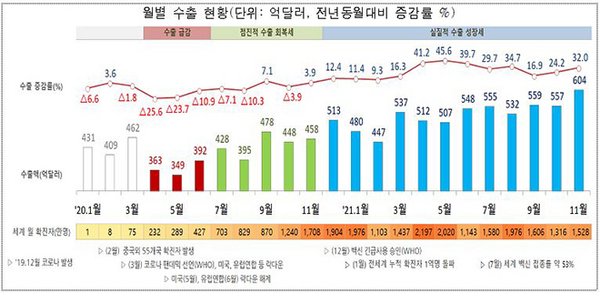 수출 증가세는 올해 본격화되면서 올 1~4월 누적 수출액이 1976억 달러로 역대 최대를 기록했다. 10월에는 역대 최단기간 무역액 1조 달러를 달성했으며 11월에는 604억 달러로 월 수출실적이 최초로 600억 달러를 돌파했다.