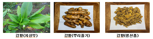 현재 대한민국약전에는 강황은 Curcuma longa Linne의 뿌리줄기로서 속이 익을 때까지 삶거나 쪄서 말린 것이라 정의하고 있다.