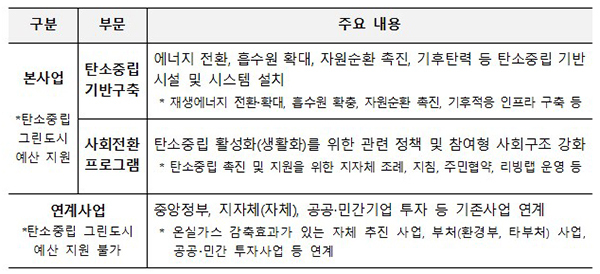 ▲ 본사업 주요내용.‘탄소중립 그린도시’ 대상지로 선정된 지역은 앞으로 5년간 탄소중립 선도 본보기(모델)로서 시행계획 수립 및 사업 시행을 위한 비용을 지원한다.