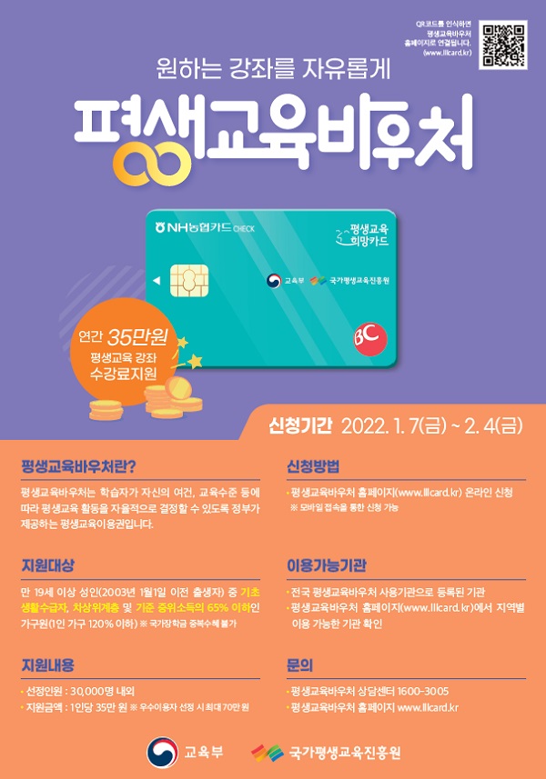 교육부와 국가평생교육진흥원은 1월 7일부터 2월 4일까지 ‘2022년 평생교육이용권(평생교육바우처, 이하 이용권)’ 신청을 받는다고 6일 밝혔다.