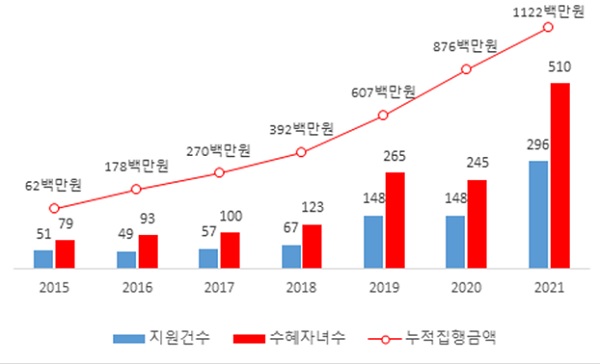 지난 2015년 도입 첫해 약 6000만 원을 지원했으며, 지난해까지 7년간 총 1415명의 미성년 자녀에게 약 11억 2000만 원을 지급했다.