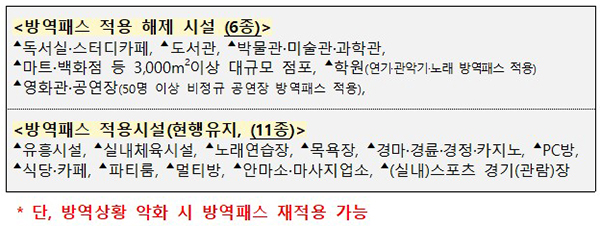 [일간환경연합 신상미 기자]오는 18일부터 독서실·스터디카페, 대형마트·백화점 등 6종 시설의 방역패스가 해제된다. 단, 유흥시설 등 11종 시설은 방역패스 적용이 계속 유지된다.