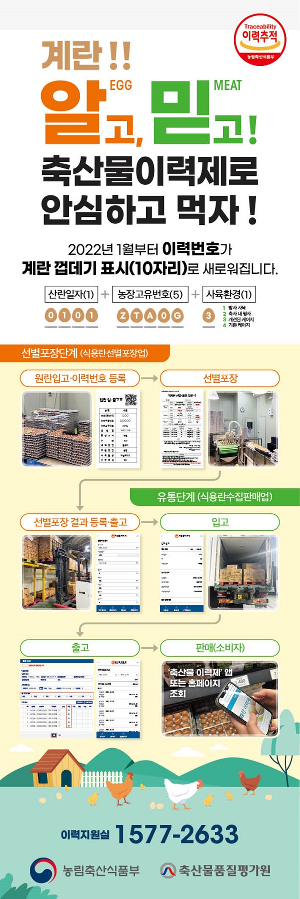 이번 개정에 따라 소비자는 앞으로 기존 12자리의 계란 이력번호가 아닌 10자리의 계란 껍데기 표시정보로 계란 생산자·선별포장업자·수집판매업자 등의 생산·유통 이력정보를 확인할 수 있게 된다.