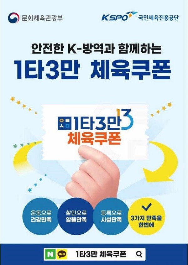 [일간환경연합 한선미 기자]문화체육관광부는 국민체육진흥공단과 함께 국민의 안전한 체육활동을 장려하고 코로나19로 어려움을 겪고 있는 민간 실내체육시설을 지원하기 위해 24일부터 ‘1타3만 체육쿠폰’ 사업 사전접수를 시작한다고 밝혔다.