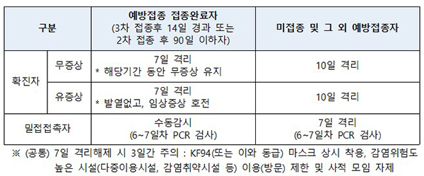 이에 확진자 격리기간은 예방접종완료자는 7일이며 미접종자 및 이외 접종자는 10일이다. 그리고 밀접접촉자 중 예방접종완료자는 수동감시를, 미접종자 등은 7일 자가격리하며 모두 6∼7일차에 PCR검사를 한다.