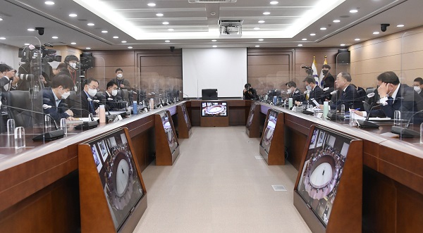 ▲ 홍남기 부총리 겸 기획재정부 장관이 25일 정부세종청사에서 열린 ‘제227차 대외경제장관회의 겸 140차 대외경제협력기금운용위원회’를 주재, 모두발언을 하고 있다. (사진=기획재정부)정부는 먼저, 신시장 창출을 통해 경제회복을 이끌기로 했다.