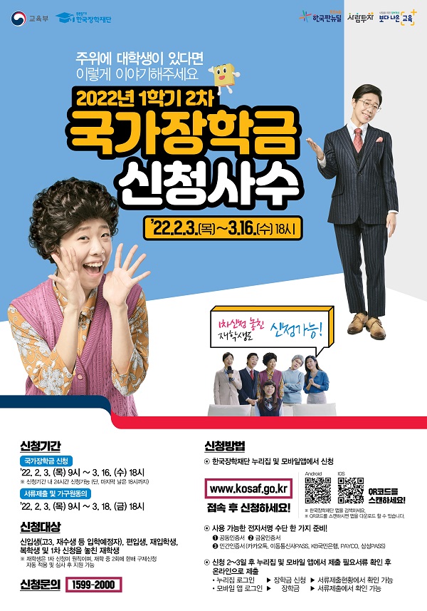 교육부는 이 같은 내용을 담은 ‘2022년 학자금 지원 기본계획’을 발표하고, 2월 3일 9시부터 3월 16일 오후 6시까지 올해 1학기 2차 국가장학금 신청을 받는다고 26일 밝혔다.