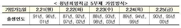 정식 출시 첫 주인 21~25일에는 5부제 가입방식이 적용된다. 1991·96년생과 2001년생은 21일 가입이 가능하고, 1987·92·97년생과 2002년생은 22일 가입할 수 있다. 1988·93·98년과 2003년생은 23일, 1989·94·99년생은 24일, 1990·95년생과 2000년생은 25일 가입 가능하다.