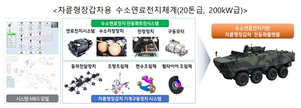 방사청은 수소경제를 선도하고 있는 국내 민수 핵심기술을 국방에 접목해 수소연료전지 시스템을 개발할 예정이며, 산업부는 방사청과 민간기관(한국자동차연구원, 업체 등)간의 협력체계 구축을 지원하고 올해는 200kw급 차륜형장갑차용 수소연료전지 및 전동화 추진시스템 개발을 소재부품기술개발사업으로 지원할 예정이다.