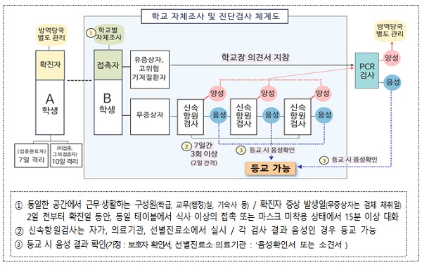 학교 내 확진자 발생 시 방역당국에서 제시한 기준에 맞춰 학교가 자체적으로 접촉자를 분류해 신속항원검사 또는 PCR 검사를 지원한다. 접촉자 중 유증상자, 고위험 기저질환자는 곧바로 선별진료소에서 PCR 검사를 받고 음성인 경우 등교 및 출근이 가능하며, 그 외 접촉자 중 무증상자는 7일간 3회 이상 신속항원검사를 실시해 각각 음성인 경우 등교 및 출근이 가능하다.