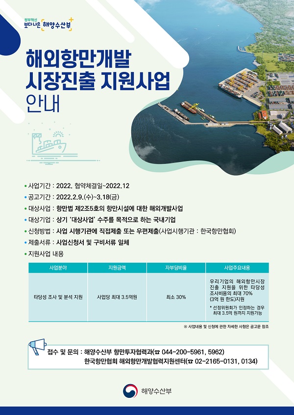 [일간환경연합 김경훈 기자]해양수산부는 9일부터 3월 18일까지 해외 항만개발 타당성 조사 비용의 최대 70%를 지원하는 ‘해외 항만개발시장 진출 지원사업’ 대상자를 모집한다고 8일 밝혔다.