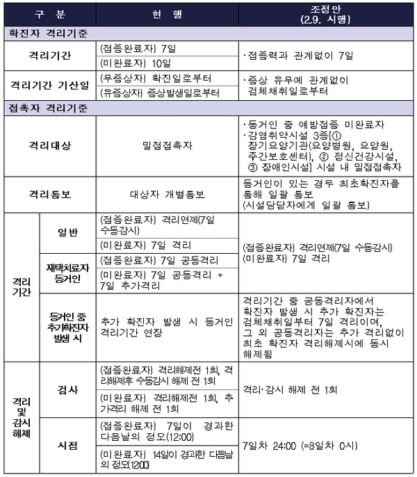 확진자의 밀접접촉자는 모두 자가격리를 해야 했으나 9일부터는 동거인 중 예방접종 미완료자, 감염취약시설 내 밀접접촉자만 7일간 격리한다.