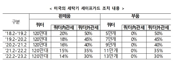 미국 정부는 수입산 세탁기로 인해 심각한 피해를 입고 있다는 자국 업계의 주장을 수용해 지난 2018년 2월부터 세탁기 세이프가드 조치를 부과중이며, 이에 우리 정부는 그해 5월 WTO에 제소했다.