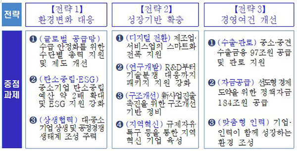 다만 최근 탄소중립·이에스지(ESG), 공급망 재편 등 경제환경 변화에 따른 불확실성이 증가하는 국면에서 중소기업에 대한 특단의 관심과 대책이 필요한 만큼, 중소기업 관련 대책들을 감안한 10대 분야의 핵심 정책과제에 대해 향후 관계부처와 함께 집중 지원할 계획이다.