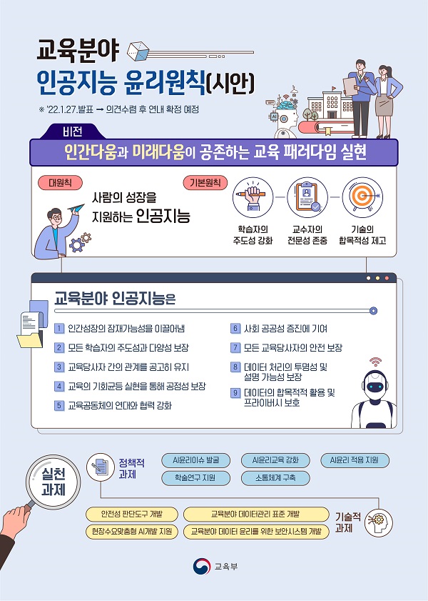 공청회에서 논의될 교육분야 인공지능 윤리원칙(시안)은 교육현장에서 인공지능을 안전하고 윤리적으로 활용하기 위해 교육계와 관련 산업계가 준수해야 할 주요 원칙을 담고 있다.