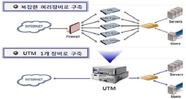 통합보안장비(UTM, Unified Threat Management)는 방화벽, 침입탐지시스템, 침입방지시스템 등 다양한 정보보호 기능을 통합한 보안솔루션을 일컫는다.