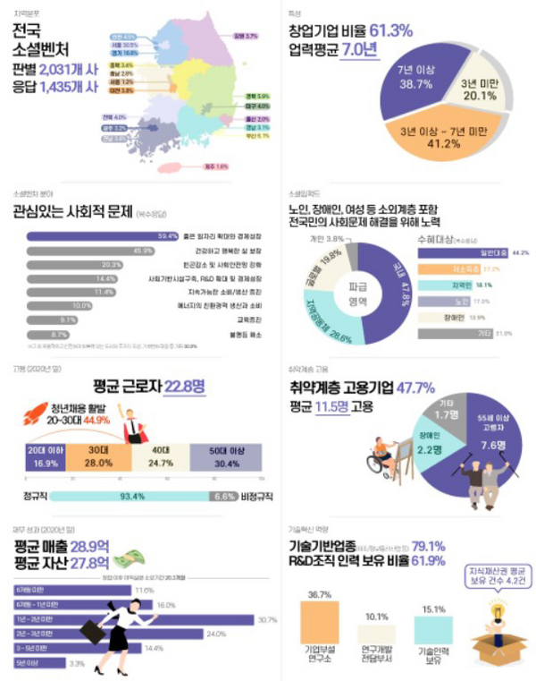 2020년 소셜벤처의 평균 매출액은 28억 9500만원으로 2019년 평균 매출액 24억 4400만원보다 4억 5100만원 증가(18.5%)한 것으로 나타났다. 투자를 받은 금액은 2671억원으로 2019년 282억원에 비해 9배 이상 늘었다.