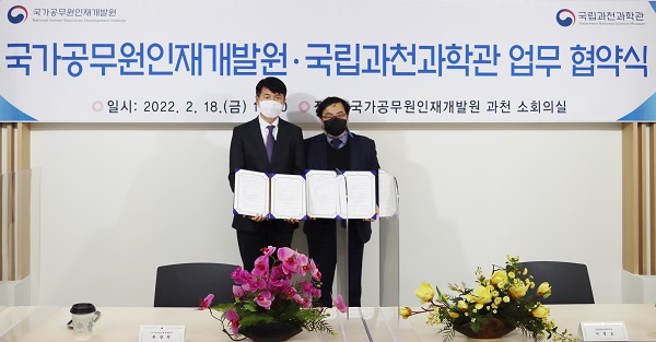 국가공무원인재개발원과 국립과천과학관은 18일 국가인재원 과천분원에서 ‘우수 연구성과 상호 활용을 위한 양해각서(MOU)’를 체결했다고 밝혔다.