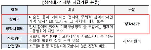 창작대가는 전시 참여에 대한 참여비와 기획, 구상, 창작 등 투입되는 행위에 대한 창작사례비로 구분하고, 이를 산정하기 위한 참고기준을 제시해 ‘미술 창작대가 지급기준’으로 정리했다.