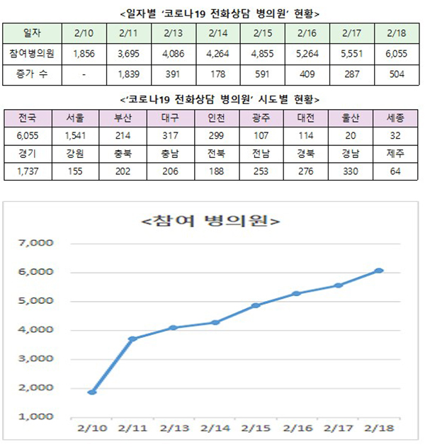 전국에서 전화 상담·처방이 가능한 ‘코로나19 전화상담 병·의원’은 지난 10일 1856곳에서 18일 기준 6055곳으로 일 평균 약 18.4% 씩 빠르게 증가하고 있다.